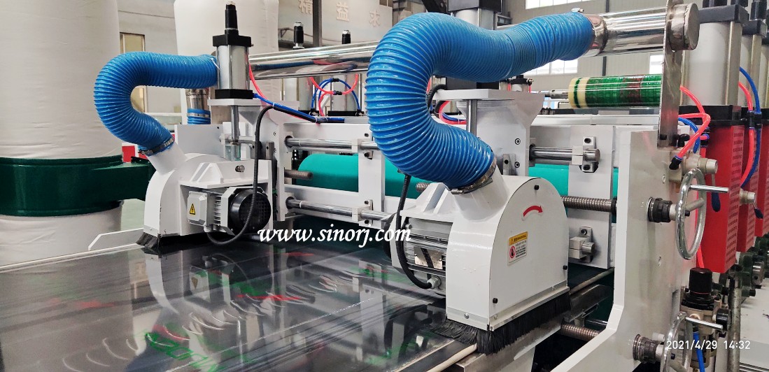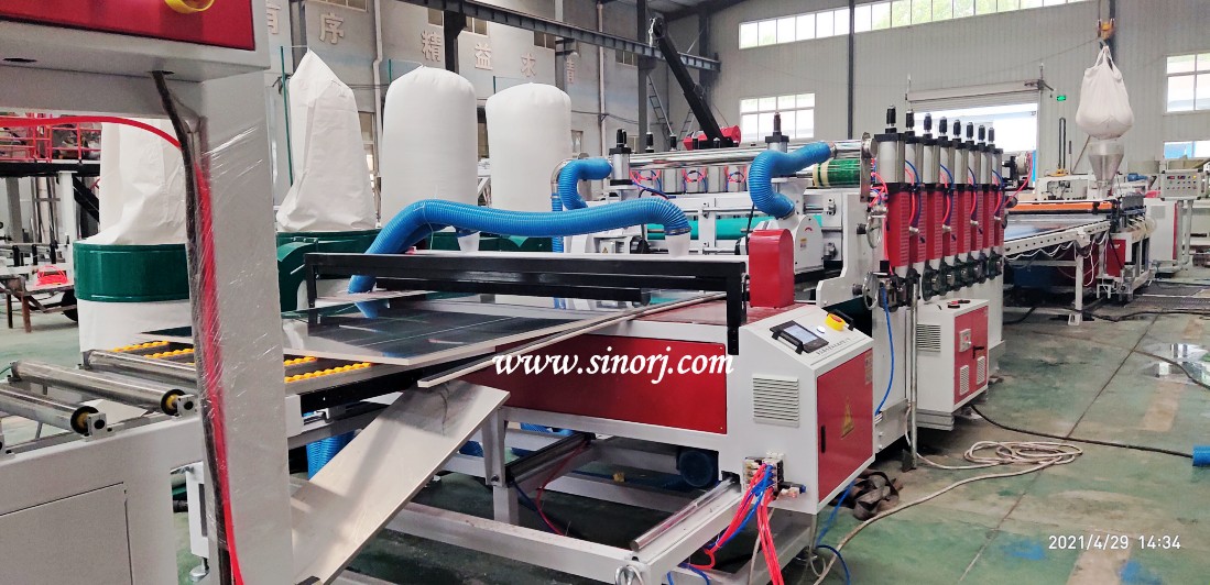 雙螺桿80擠出機、定型平臺、八輥牽引機、橫向切割機、落料架組成。這里說的組成是指純生產(chǎn)線,此外還需要配置擠出板模具、水冷卻定型模具、混料機、破碎機、磨粉機才能完成完整的生產(chǎn)過程。